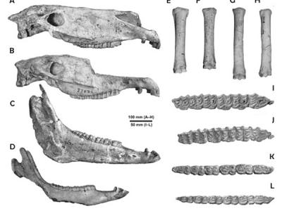 下层(A,C,E,G,I,K)与上层(B,D,F,H,J,L)埃氏马化石的头骨(A,B),...