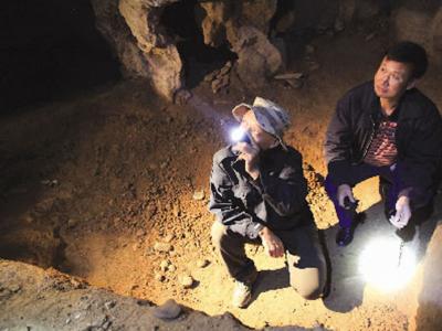 福岩洞外景 熊友邦激动地向记者讲述他挖到的第一枚人牙化石 杨雄心介绍福岩...