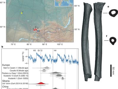 发现于西伯利亚西南部额尔齐斯河岸距今约4.5万年的一块几近完整的人类股骨化石(...