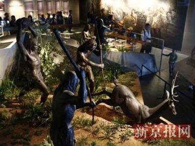 博物馆新馆内展出的北京人头盖骨化石模型 观众在博物馆新馆参观 (神秘的地球...