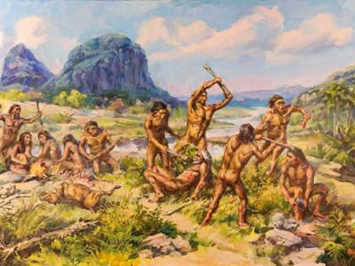 马坝人生活景象复原图(李荣山绘制) 马坝人头骨表面的创伤痕迹,CT扫描显示马...