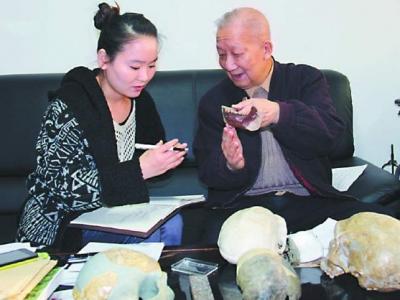 中国科学院院士吴新智向记者介绍广西崇左木榄山智人洞出土的古人类下颌骨特征 核...