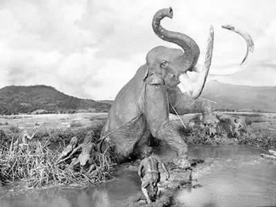 直立人猎杀大象模拟场景图 大象是直立人的重要食物,占其肉食的60%。考古显示,...