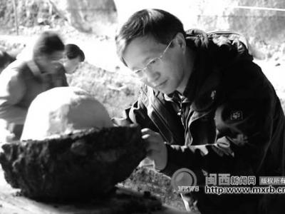 中科院古脊椎动物与古人类研究所副所长、研究员高星在研究刚刚出土的史前人类头盖...