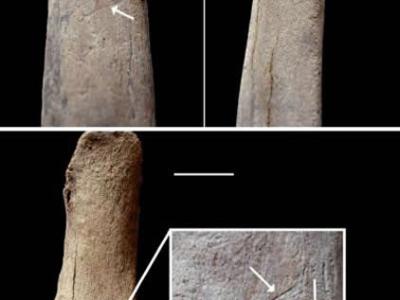 照片为有屠杀切口痕迹的猛犸象肋骨 研究人员报告说,人们在俄国的乌拉尔山中发现...