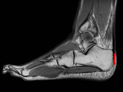 长跑运动员的脚部核磁共振图,跟骨与跟腱紧密连接,测量跟骨的长度(红线)有助于...