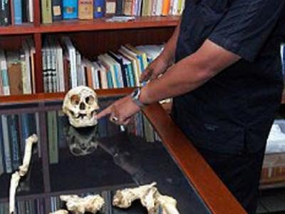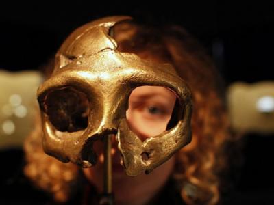2月25日,克罗地亚Krapina尼安德特人类学博物馆,一名女性正在观察尼安德特人头骨...