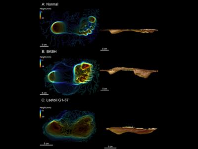 图中A为现代人脚印,直立步态;B为现代人脚印,弯膝翘臀步态;C为莱托里脚印。 ...