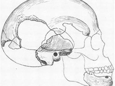 博斯科普(Boskop)头骨的重建图素描,1918年绘制。阴影部分为复原的骨骼。(美国...