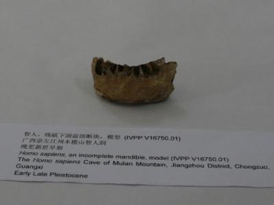 智人,残破下颌前部断块 出土地点:广西崇左江州木榄山智人洞 地质时代:晚更新世...