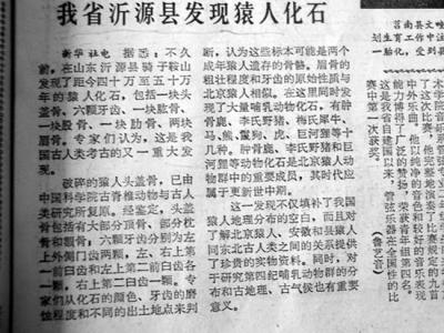 当年《大众日报》的报道发现沂源猿人化石 沂源猿人发掘队员合影(前排左二为吕...