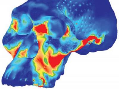 此图为非洲南方古猿人头盖骨的应压力图。非洲南方古猿是一种已经灭绝了的早期人类...