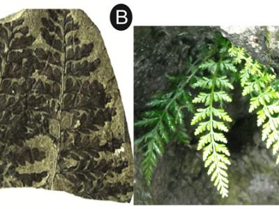 铁角蕨化石(A,引自尹殿奎等,2008)和现代类群代表(B, 北京铁角蕨,采自贵州梵...