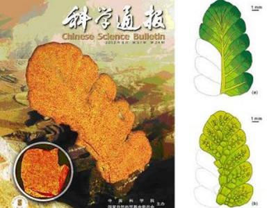 2012年《科学通报》24期中文版封面(左)和新种保德鳞羊齿的复原(右), (a)和(b)分...