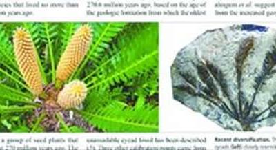 《科学》杂志上登载的“全泽尔”化石(右)与现生铁树照片对比。 最近出版的美国《...