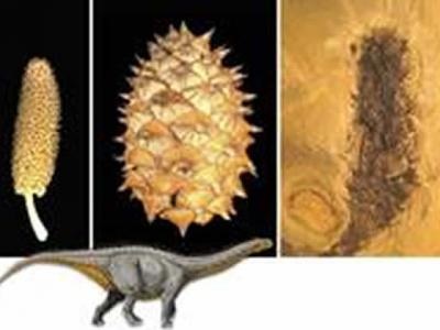 巨脚龙能够啃食古老的Walchiostrobus球花(右),它看起来像今天的雄球花(左),...