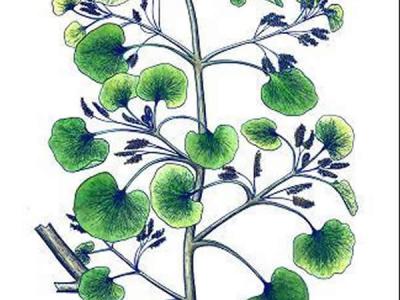 华夏植物群种子植物髻子羊齿科Nystroemia reniformis复原图。比例尺5cm 英国《皇...
