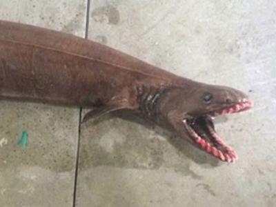 澳洲惊现史前皱鳃鲨 300利牙噬咬猎物