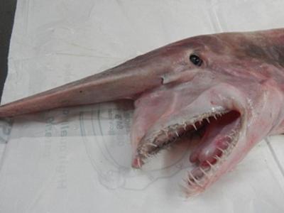 这条剑吻鲨在澳大利亚新南威尔士州南部海岸附近被捕获 剑吻鲨十分罕见,通常生...