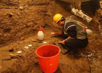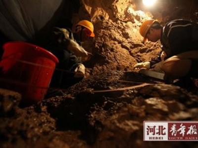 石家庄“水帘洞遗址” 一个20平方米大小的山洞内,5名考古队员正在一个角落...