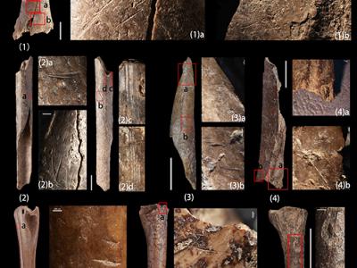 鸟类骨骼表面的切割痕迹 (1a, 1b, 2a, 2b, 3a, 3b, 4b, 5a, 6a, 7a), 劈裂痕迹 (4a...