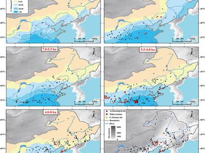 中国北方14.0 ka以来区域C4生物量等值线图和黍粟遗存与考古遗址的时空变化. (王建...