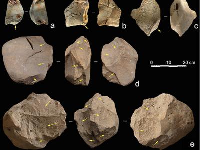 百色盆地的大石片和大型石核标本,黄色箭头指示打击方向(供图 李浩、雷蕾)百色盆...