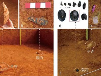 广西百色盆地新鲜陨石与手斧同层出土场景;a-c为南半山遗址,d-f为枫树岛遗址(李浩...