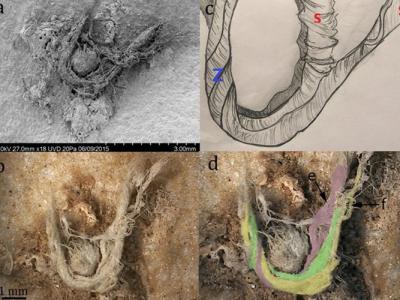 一块哺乳动物头骨化石,牙齿窝里的沉积物,原来是史前蜜蜂筑的巢穴。图片来源:uux...