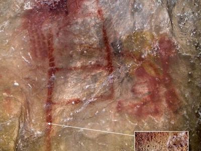 科学家在西班牙一处洞穴中发现这幅由红色水平与垂直线组合成的...