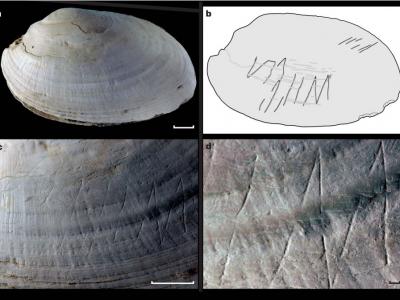 刻在一片贻贝壳化石上的锯齿状线条,可能是几何艺术最早的证据。 PHOTOGRAPH BY ...