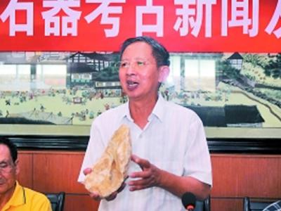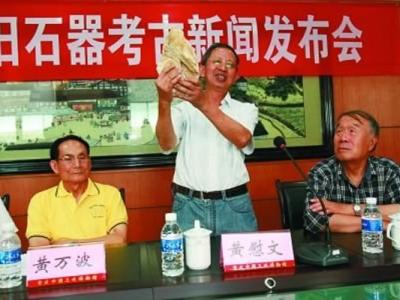 研究员黄慰文(中)展示17万年前古人用剑齿象额骨制作的手斧 百万年前的石器 百...