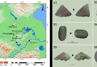 图1.双墩遗址地理位置及遗址出土不同类型石质加工工具图2.双墩遗址石质工具表面提取...