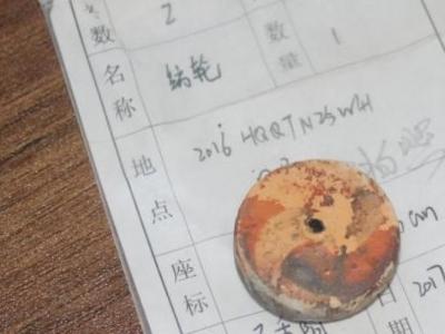 漩涡纹彩陶纺轮外观呈圆形,中间有小孔,其上可见黑...
