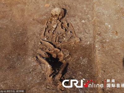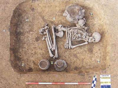 在布拉格郊区发现的这具石器时代的男性骸骨头朝东,身边摆放的是日常使用的罐子,...
