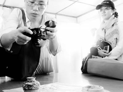 4月27日,在“南澳Ⅰ号”打捞船“南天顺”上,记者正在拍摄前一天出水的青花弦纹...