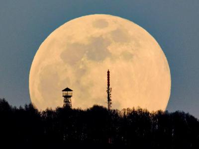 从匈牙利看到的超级月亮通透皎洁。美国看到的圆月被薄雾遮掩。...