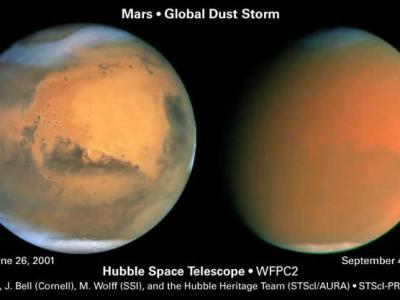 哈伯望远镜在2001年火星冲后,拍摄的火星影像,左图可以清楚看...