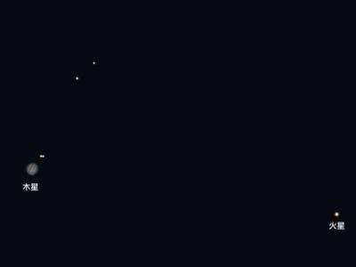 木星合火星,上方为北方,图中木星右上方的是它的四大卫星。(...