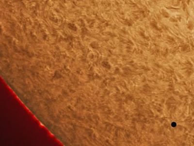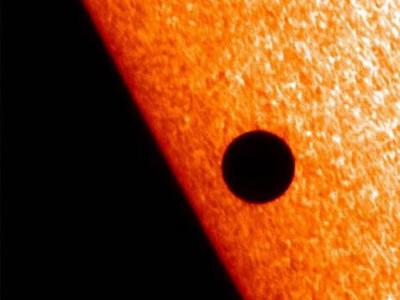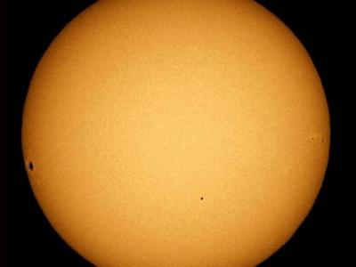图为2006年11月8日发生的“水星凌日”。中间小黑点是水星投影,左侧较大黑点和右...