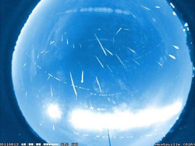 2011年8月12日至13日,在美国亚拉巴马州亨茨维尔以星空摄影机拍到的英仙座流星雨...