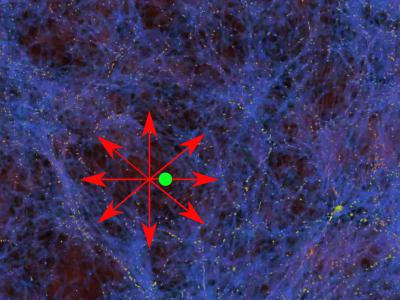图像显示了物质在空间中的分布——(蓝色;黄点代表单个星系)。银河系(绿色)位于一个...