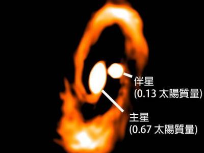 超级电脑计算的理论模型,显示两条旋臂各从主星与伴星延伸而出,连接到环双星盘;...