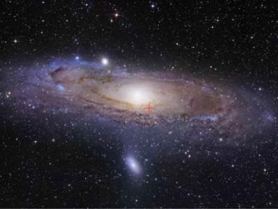 十字线显示仙女座星系(M31)中微类星体的位置 科学家在银河系外首次发现能撕裂恒...