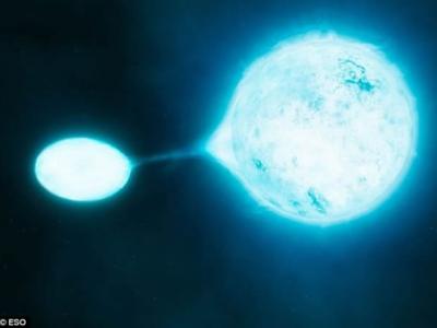 艺术概念图,展示了双星系统中的“吸血鬼”吸食伴侣物质的景象。借助于欧洲南方天...