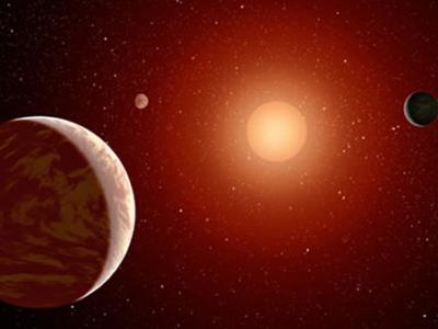 艺术家描绘的一颗年轻红矮星被三颗行星所环绕,这样的恒星比太阳更加昏暗,但最新...