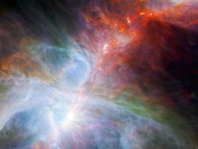 这是猎户座大星云的照片,综合了斯皮策和赫歇尔望远镜的红外波段观测数据,揭示出...