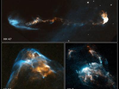 这是哈勃望远镜拍摄的图像,这些团块状发光喷流体是恒星新生的标志。它们被称作“...