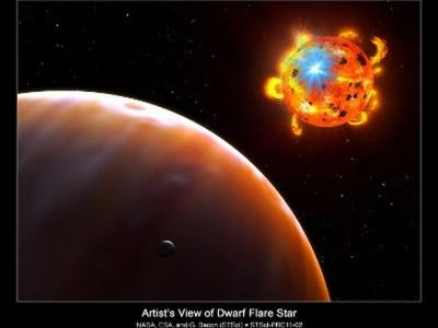 这是一幅示意图,显示一颗红矮星正发生一次耀斑现象,前景中是一颗假想的行星 (...