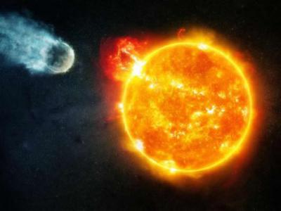 展示了3I/ATLAS的艺术想象图,它经过太阳附近,照亮了彗星的一侧。彗星靠近太阳的一...